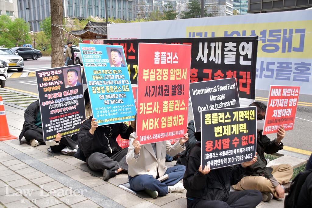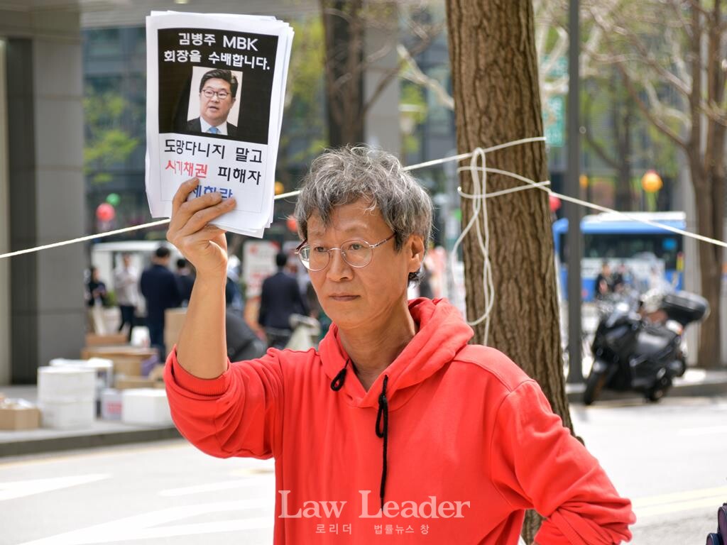 [로리더] 홈플러스 물품구매 전단채 피해자 비상대책위원회(위원장 정희왕, 이하 비대위)가 서울 청진동 MBK 파트너스 본사 앞에서 집회를 연 17일, 비대위 이의환 상황실장은 “지금이라도 김병주 회장이 사재를 출연해 홈플러스를 정상화하라”고 요구했다.