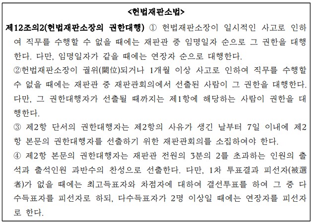 ②항은 “헌법재판소장이 궐위(闕位)되거나 1개월 이상 사고로 인하여 직무를 수행할 수 없을 때에는 재판관 중 재판관회의에서 선출된 사람이 그 권한을 대행한다. 다만 그 권한대행자가 선출될 때까지는 제1항에 해당하는 사람이 권한을 대행한다”고 규정하고 있다.