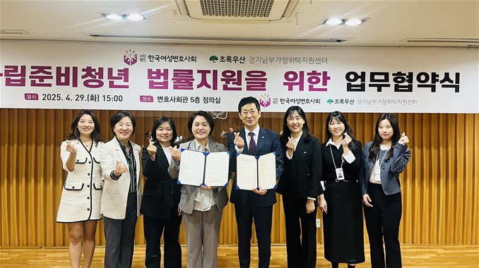 [로리더] 한국여성변호사회(회장 왕미양)는 29일 초록우산 경기남부가정위탁지원센터(관장 조현웅)와 업무협약을 체결하고, 자립준비청년과 위탁가정 등에서 보호를 받는 아동들의 건강한 자립을 위해 법률상담, 소송구조, 법률교육 등 긴밀한 업무 협력을 해 나가기로 했다.