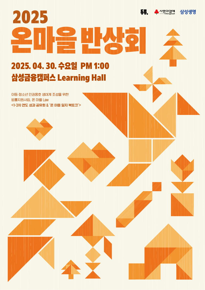 4월 30일 열린 ‘온 마을 Law’ 성과 공유 행사 ‘2025 온 마을 반상회’에는 김진석 온 마을 Law 자문심의위원회 위원장, 백선희 국회의원(조국혁신당), 최보윤 국회의원(국민의힘), 두루 임성택 이사장, 홍원학 삼성생명 사장 등 내외빈과 ‘온 마을 Lawyer’, 아동ㆍ청소년 관련 단체 관계인 등 100여 명이 참석한 가운데 사업성과 발표, 아동ㆍ청소년 권리옹호활동 공유 등의 프로그램이 진행됐다.