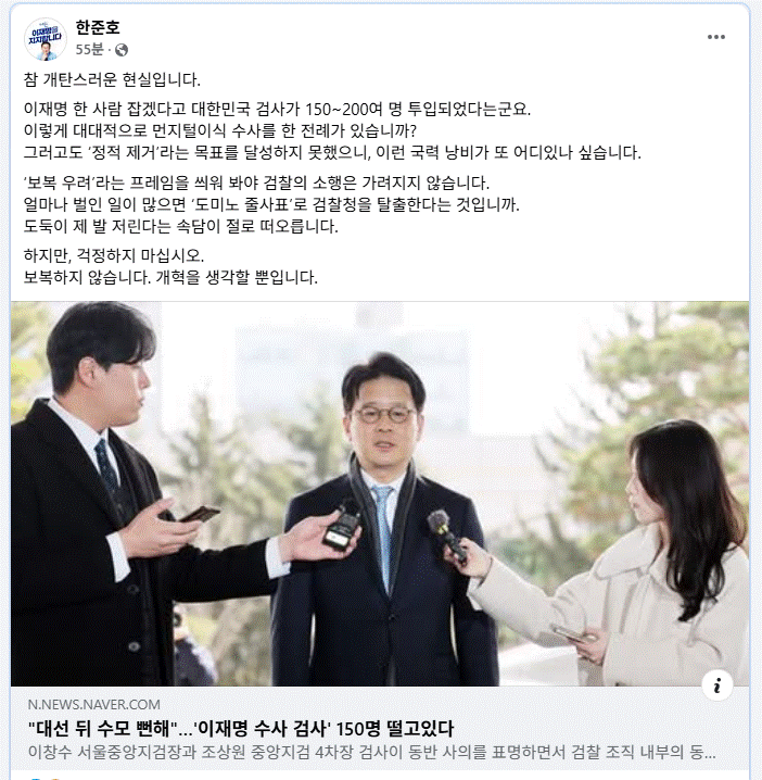 한준호 국회의원은 “참 개탄스러운 현실”이라며 “이재명 한 사람 잡겠다고 대한민국 검사가 150~200여 명 투입되었다는군요”라고 어이없어했다.