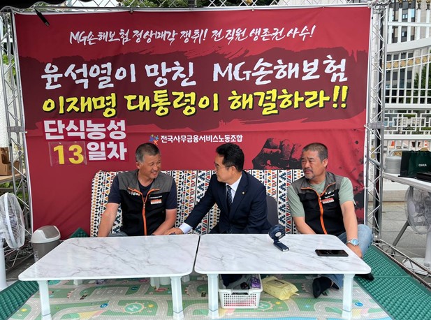 [로리더] 더불어민주당 을지로위원장인 민병덕 국회의원이 10일 서울 정부서울청사 앞에서 단식 농성을 벌이고 있는 MG손해보험 김동진 전국사무금융서비스노동조합 부위원장을 찾아 단식 중단을 설득했다.