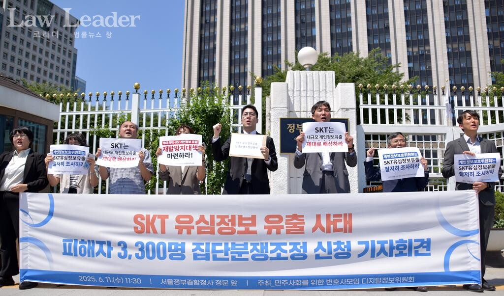 민주사회를 위한 변호사모임(민변) 디지털정보위원회는 이날 오전 10시 30분, 서울정부종합청사 정문 앞에서 기자회견을 열어 “SKT는 가입자 식별키 기준 2695만 7749건의 유심정보가 유출되는 역대 최대 규모의 정보 유출 사태에도 피해자에 대한 어떠한 실질적 구제조치를 취하지 않고 있다”면서 “이와 관련해 개인정보보호위원회에 피해자 3266명을 대리해 개인정보분쟁조정 신청서를 제출한다”고 밝혔다.