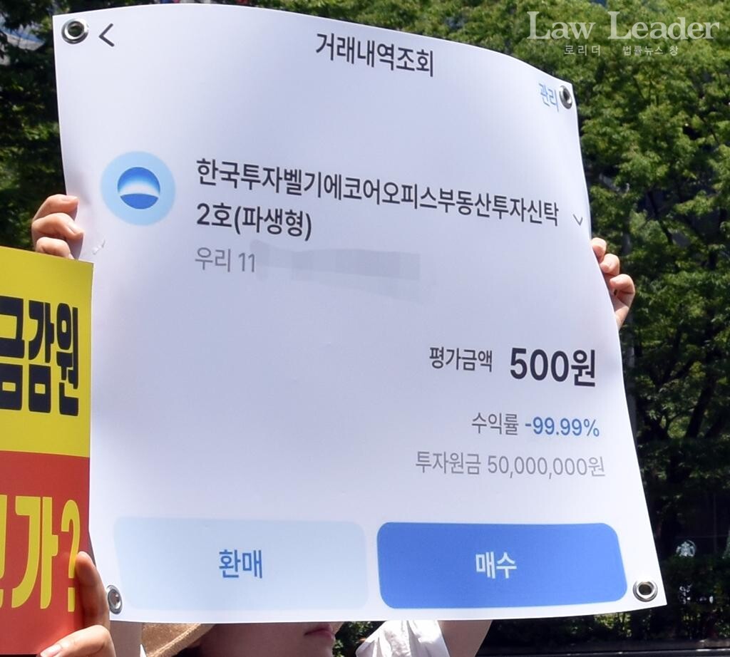 피해 투자자들은 ▲한국투자증권의 책임 있는 공식 사과 ▲피해자 원금 회복 대책 수립 ▲금융당국의 즉각적인 진상조사 착수 및 제재 조치 등을 요구했다.