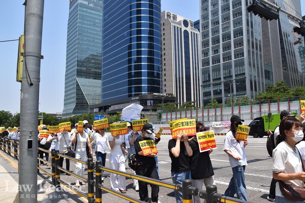 이날 100여명의 피해투자자들은 “사기펀드, 벨기에펀드. 김성환은 물러가라”는 팻말을 들고 나와, 한국투자증권 김성환 대표이사의 사퇴를 요구하는 목소리를 냈다.