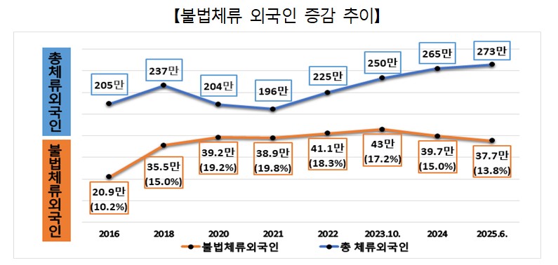 불법체류 감소 추이를 보면 2023년 10월 43만 명에서 2025년 6월 37만 명으로 줄었다.