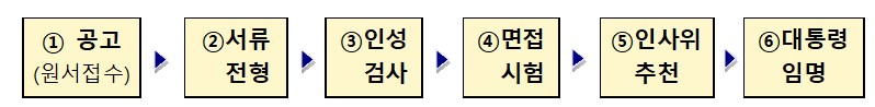 원서접수가 끝나면 8월부터 서류전형, 면접시험이 차례로 진행되며, 인사위원회 추천 절차를 거쳐 대통령이 최종 임명한다.