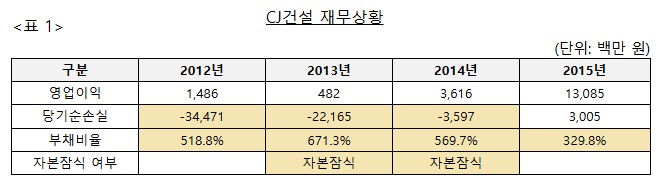 CJ건설은 2010년부터 2014년까지 5년 동안 980억원의 당기순손실이 발생했고, 2013년과 2014년에는 자본잠식 상태에 빠지며 지속적으로 신용등급 하락 압력에 직면해 있었다.