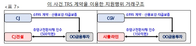 CJ그룹 내부적으로 TRS 계약을 ▲“발행사(지원객체) 미상환시 (지원주체의) 대납조건”, ▲“(신용등급이 낮은 지원객체를 지원하기 위한 지원주체의) 신용보강 계약”이라고 칭함.