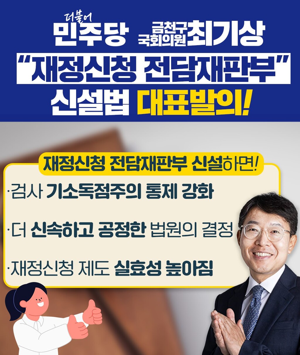 최기상 의원은 “재정신청 전담재판부가 설치된다면, 기소 권한 오용ㆍ남용을 통제하고 더 신속하고 공정한 법원의 판단을 기대할 수 있다”고 전망했다.