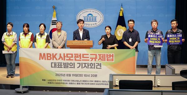 한창민 의원은 “결국 MBK가 법정관리를 신청하면서 피해는 노동자ㆍ자영업자ㆍ소비자ㆍ연금가입자ㆍ채권투자자에게 전가됐다. 더욱 놀라운 것은 MBK와 같은 사모펀드는 투자 내역, 부채 규모, 고정보수와 성과보수, 보수산정방식 같은 기본적인 정보조차 일반에 공개하지도 감독기관에 보고하지도 않는다”고 전했다.