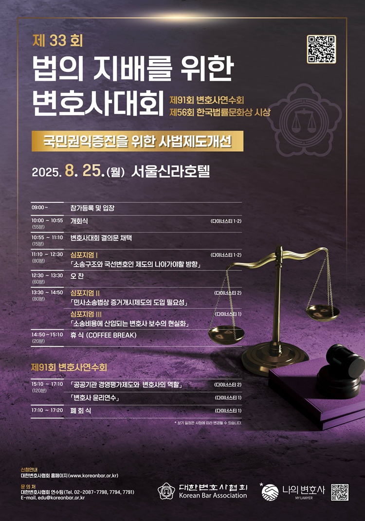 [로리더] 대한변호사협회(협회장 김정욱)는 8월 25일(월) 10시 서울신라호텔(서울 중구 동호로)에서 “제33회 법의 지배를 위한 변호사대회 및 제91회 변호사연수회”를 개최한다.