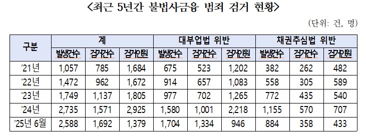 4일 한병도 더불어민주당 국회의원이 경찰청으로부터 제출받은 자료에 따르면, 불법사금융 범죄(대부업법ㆍ채권추심법 위반) 발생 건수는 2021년 1,057건에서 2024년 2,735건으로 3년 새 1,678건(159%) 증가했다.