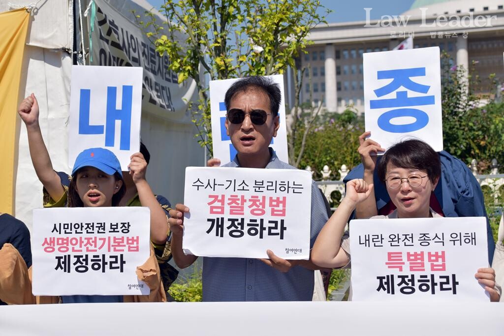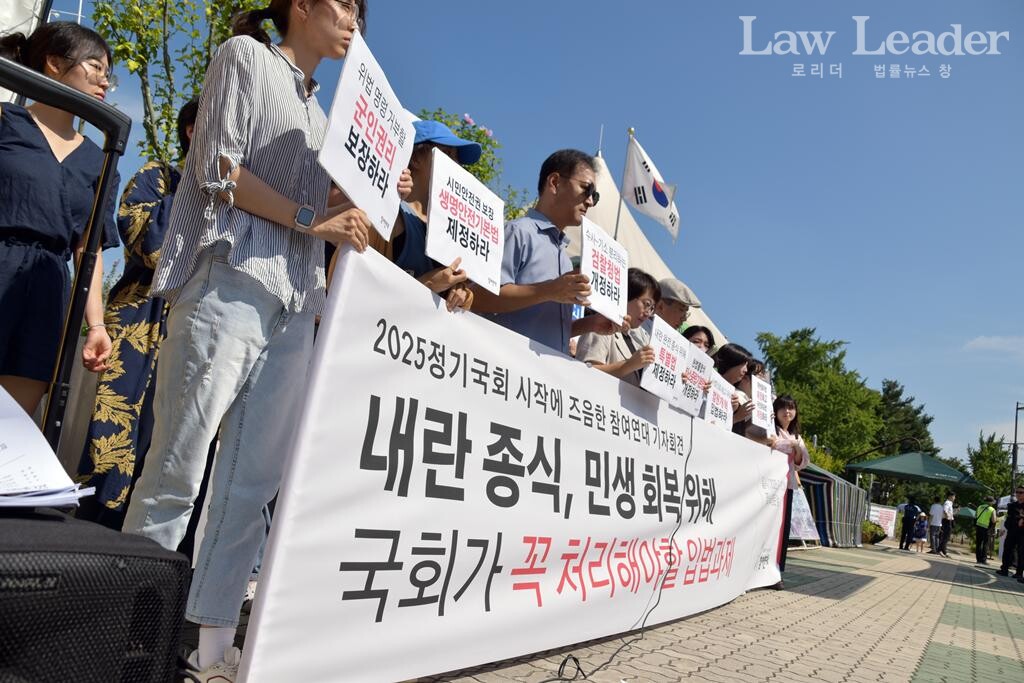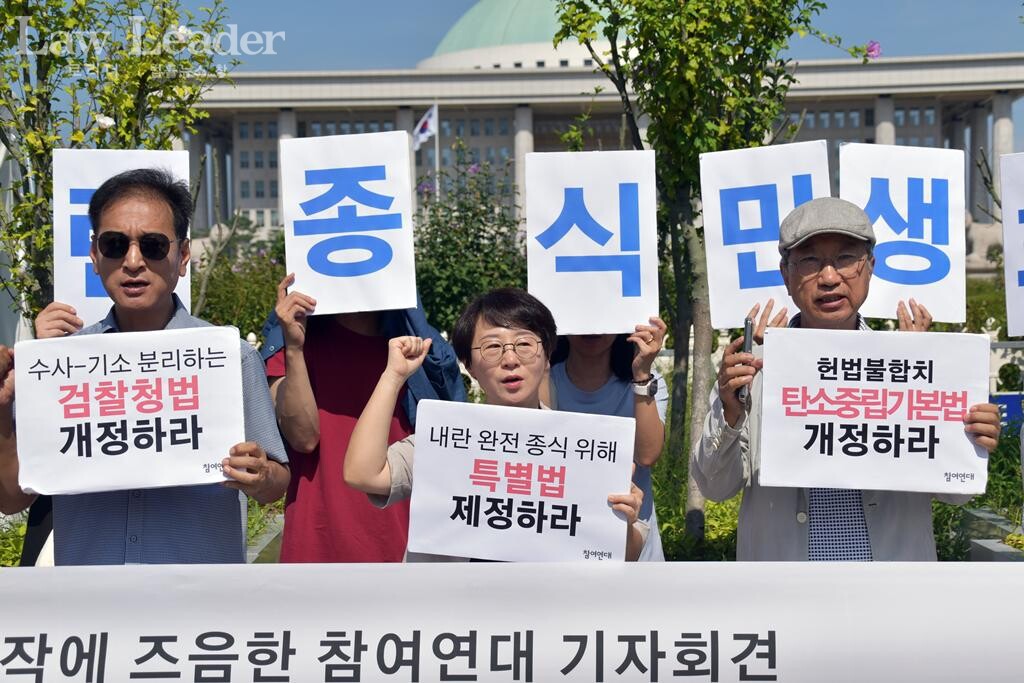 이전 기사보기 다음 기사보기 참여연대, 국회 입법과제…내란종식특별법, 검찰개혁, 법원개혁 바로가기 복사하기 본문 글씨 줄이기 본문 글씨 키우기 스크롤 이동 상태바 포토 참여연대, 국회 입법과제…내란종식특별법, 검찰개혁, 법원개혁 기자명 김길환 기자 입력 2025.09.05 14:29 댓글 0 다른 공유 찾기 바로가기 본문 글씨 키우기 본문 글씨 줄이기 이 기사를 공유합니다 페이스북(으)로 기사보내기 트위터(으)로 기사보내기 URL복사(으)로 기사보내기 닫기 [로리더] 참여연대는 지난 3일 국회 정문 앞에서 “2025 정기국회에서 꼭 처리해야 할 17개 입법ㆍ정책과제 제안 기자회견”을 개최하면서 발표했다. 김길환 기자 press@lawleader.co.kr 다른기사 보기 키워드 #참여연대 #정기국회 #입법과제 #검찰개혁 #법원개혁 #내란종식특별법 저작권자 © 로리더 무단전재 및 재배포 금지 좋아요0훈훈해요0슬퍼요0화나요0후속기사 원해요0 SNS 기사보내기 공유 이메일 기사저장 관련기사 “법원개혁, 형사 미확정 판결서 공개…판결문 발급 수수료 폐지” 참여연대 이지현 “법무부에 중수청? 벌 받을 검찰에 상 주자는 것” 참여연대 “검찰개혁ㆍ개헌 등 정기국회가 꼭 처리해야 할 입법과제” 참여연대 김희순 “검찰에 장악된 법무부에 중수청 설치는 어불성설” 참여연대 이지현 “정기국회, 내란종식ㆍ민생회복 우선처리 과제” 개의 댓글 회원로그인 | 비회원 작성자 비밀번호 댓글 내용입력 댓글 정렬 최신순 추천순 답글순 BEST댓글 BEST 댓글 답글과 추천수를 합산하여 자동으로 노출됩니다. 닫기 더보기 댓글삭제 삭제한 댓글은 다시 복구할 수 없습니다. 그래도 삭제하시겠습니까? 비밀번호 닫기 댓글수정 댓글 수정은 작성 후 1분내에만 가능합니다. 본문 / 400 비밀번호 닫기 내 댓글 모음 닫기 주요기사 [칼럼] 정완 로스쿨 교수 “불법계엄 보다 훨씬 더 불법한 2차계엄” 이재승 교수 “내란 특검, 윤석열 국제관습법 침략범죄로 기소해야” [종합] 시민계ㆍ법조계, 공익제보자 보호ㆍ고충해소 법안 마련 고심 오기형 ‘자사주 소각 원칙’ 상법 개정안…“코리아 디스카운트 해소” 내란법정 취재 박소희 “법원과 지귀연 재판부, 비상계엄 심각성 몰라” 노동조합법 시행령ㆍ시행규칙 입법예고…민변 “개정법 취지 훼손”
