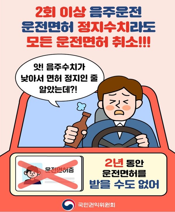 2회 이상 음주운전의 경우 운전자의 모든 운전면허가 취소될 뿐만 아니라, 향후 2년 동안 운전면허를 받을 수도 없다.