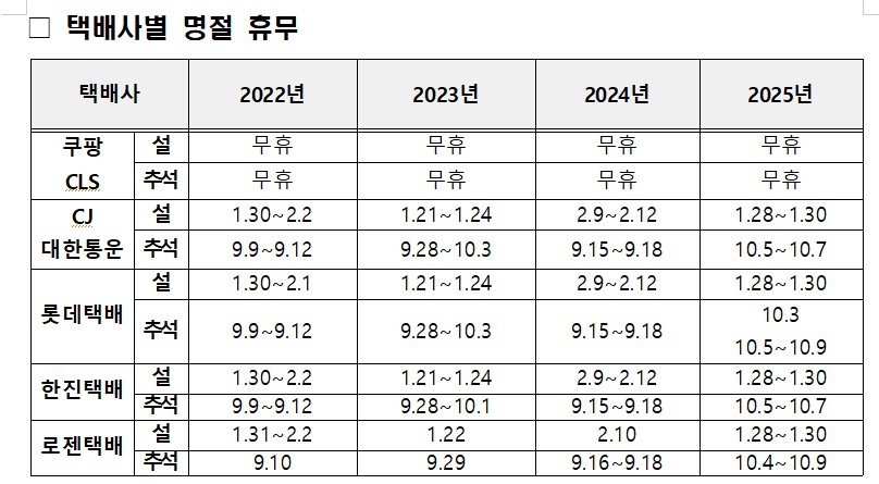 19일 국회 국토교통위원회 소속 윤종오 진보당 국회의원이 국토교통부로부터 받은 자료에 따르면, 2022년부터 2025년까지 택배 4사(CJ, 롯데, 한진, 로젠)은 명절 기간 평균 3.5일을 쉬었다.