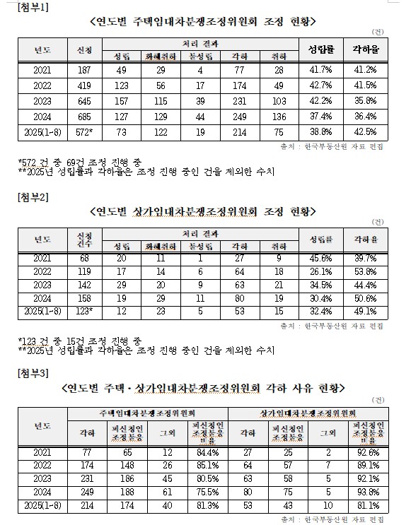 어렵사리 조정 절차가 개시되더라도 성공률은 저조했다. 주택 분쟁의 조정 성공률(조정 성립+화해 취하)은 2021년~2023년 40%에서 올해(8월 기준) 38.8%로 하락했다. 상가 분쟁 성공률 또한 2021년 45.6%였던 것이 올해는 32.4%에 그쳤다.