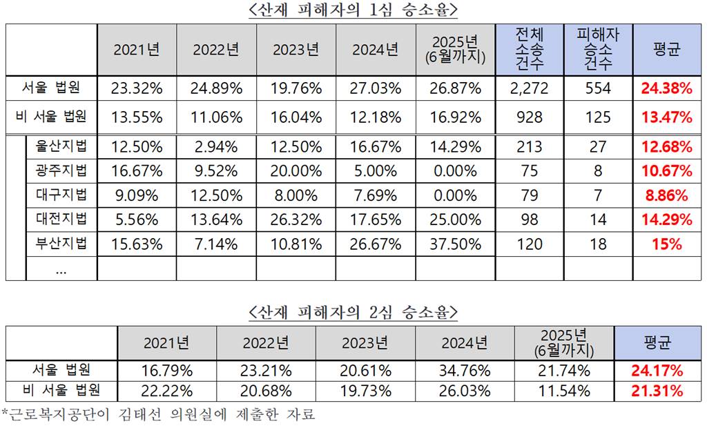 국회 환경노동위원회 소속 김태선 더불어민주당 국회의원이 근로복지공단으로부터 제출받은 자료를 분석한 결과, 최근 5년간(2021년~2025년 6월) 산재 피해자와 근로복지공단 간 1심 행정소송에서 서울 법원의 피해자 승소율은 24.4%, 지방 법원은 13.5%로, 서울에서의 승소율이 약 1.8배 높았다.