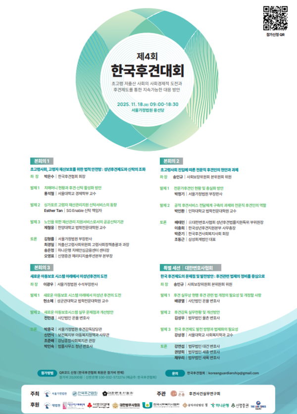 대주제는 ‘초고령ㆍ저출산 사회의 사회경제적 도전과 후견제도를 통한 지속가능한 대응 방안’으로, 세션은 총 4부다.