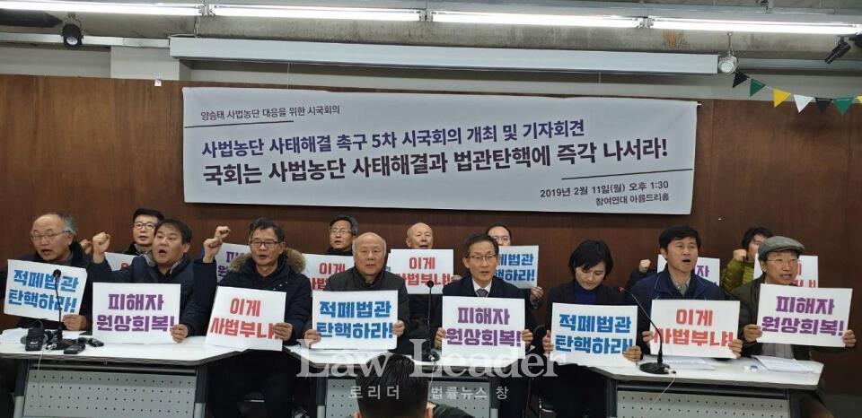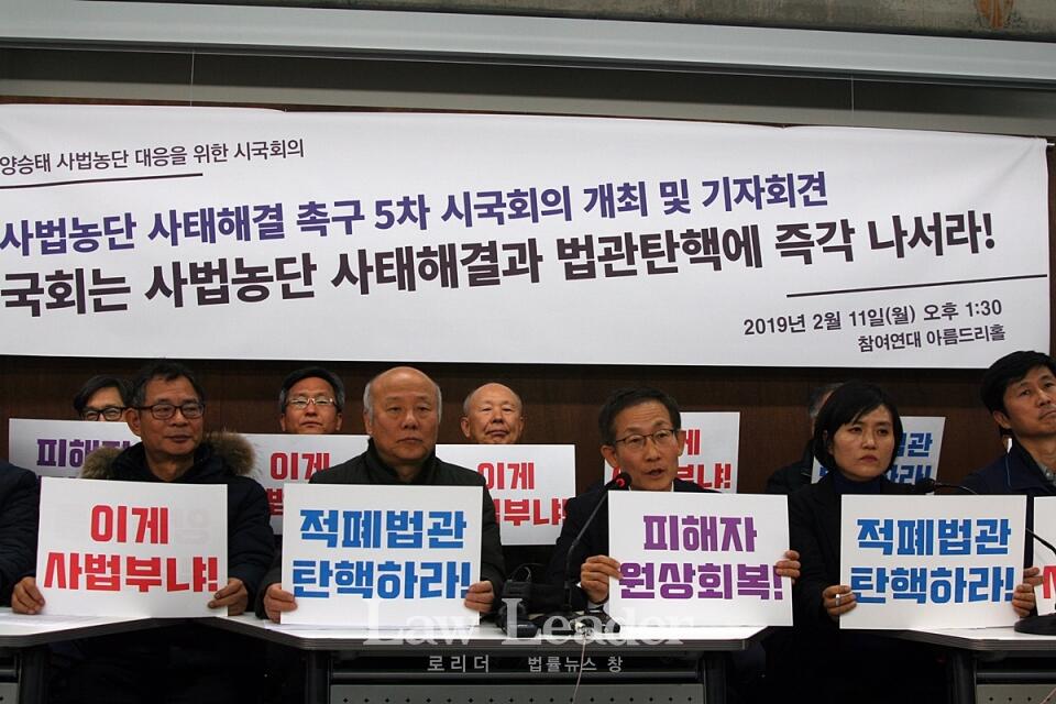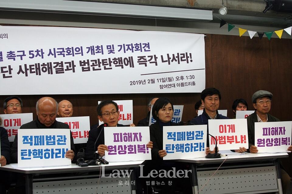 ‘양승태 사법농단 대응을 위한 시국회의’가 이날 참여연대에서 개최한 “국회는 사법농단 사태해결과 법관탄핵에 즉각 나서라!”라는 기자회견에서다. 시국회의는 민변, 참여연대, 한국진보연대, 민주노총 등 110개 단체로 구성된 단체다.