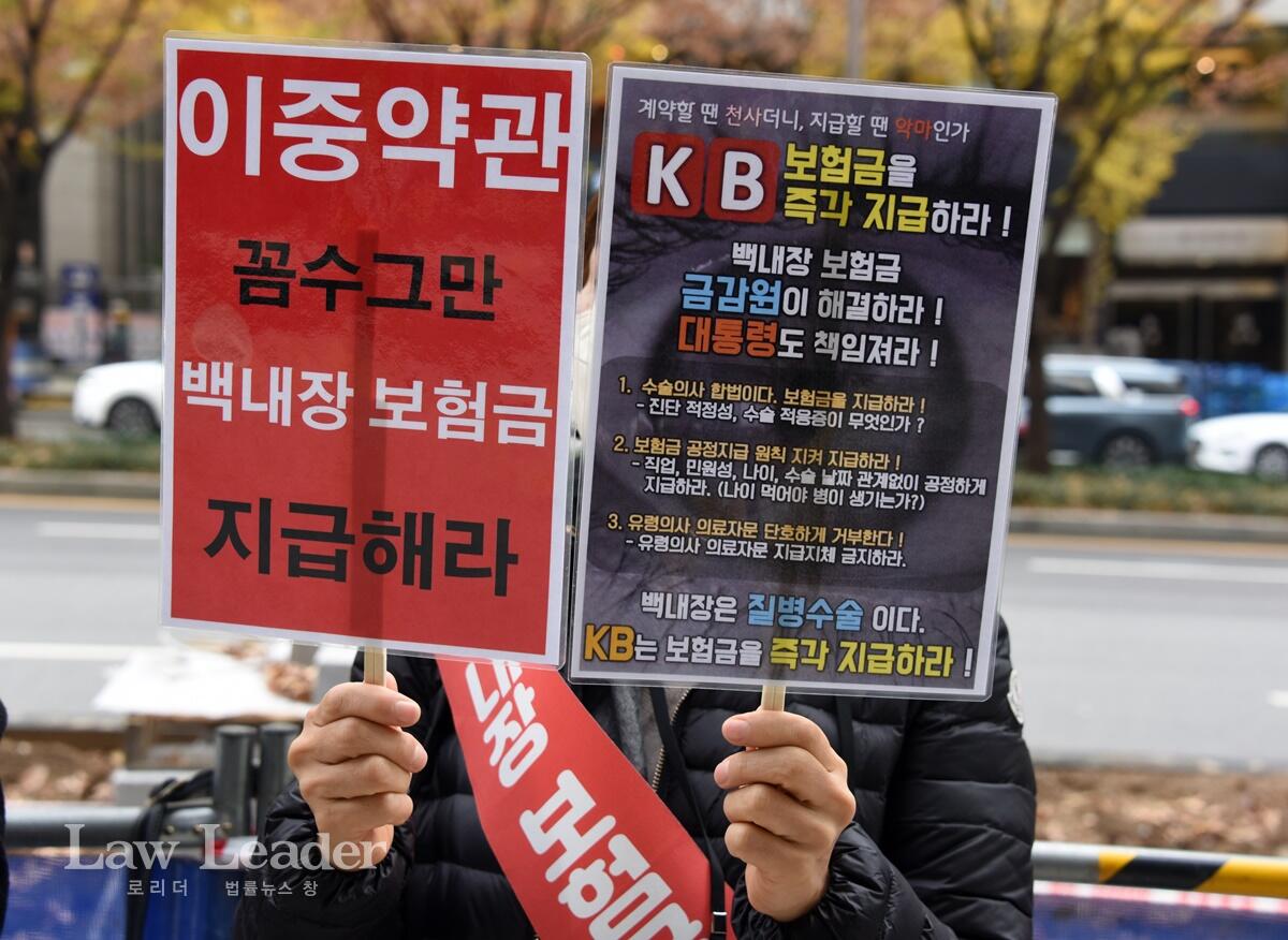 집회 참가자들은 “계약할 때 천사더니, 지급할 때 악마인가”, “KB 보험금을 즉각 지급하라”, “백내장 보험금, 금감원이 해결하라! 대통령도 해결하라!”, “KB는 보험금을 지급해라, 지급해라”, “수술의사 합법이다. 보험금을 지급하라”, “유령의사 의료자문 단호하게 거부한다”, “백내장은 질병 수술이다. KB는 보험금을 즉각 지급하라”, “이중 약관 꼼수 그만. 백내장 보험금 지급해라” “근조, KB손해보험” 등이 적힌 표지판들을 들고 나왔다.